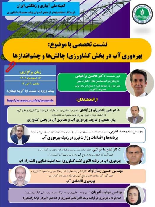 با توجه به عدم امکان توسعه (فیزیکی) بخش کشاورزی و بحران کمبود آب در کشور، بدونشک برای غلبه بر چالشهای موجود، باید راهکاری نوین و اثربخش را جستجو نمود. در همین راستا گروه كار استفاده پايدار از منابع آب براي توليد محصولات كشاورزی کمیته ملی آبیاری و زهکشی ایران در تاریخ 16 اسفند 1402 اقدام به برگزاری نشست تخصصی با موضوع "بهرهوری آب در بخش کشاورزی؛ چالشها و چشماندازها" نمود. این نشست که با دبیری آقای دکتر محسن براهیمی برگزار گردید؛ پنج سخنران آخرین یافتههای خود درخصوص بهرهوری و وضعیت آن در کشور را ارایه نمودند. در طول این نشست، کارشناسان و متخصصین مربوطه به بیان دیدگاههای خود در این خصوص پرداختند و جلسه بهصورت پرسش و پاسخ ادامه پیدا نمود.