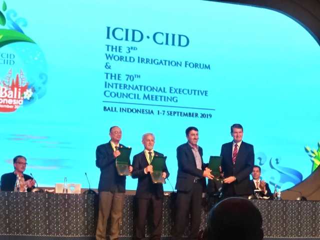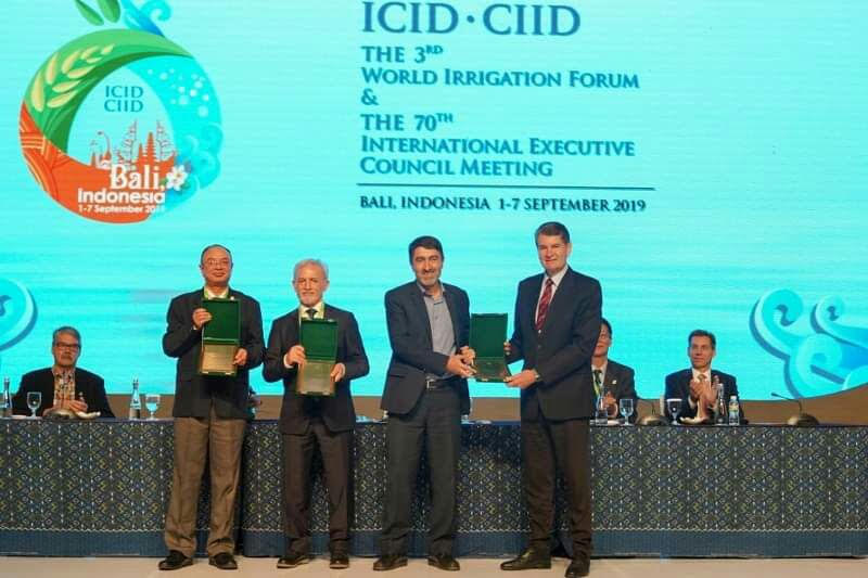 در سومین روز هفتادمين اجلاس سالانه كميسيون بينالمللي آبياري و سومين شورای جهاني آبياري که در کشور اندونزی در حال برگزاری است، طی مراسم ویژه ای جایزه دو هزار دلاری صرفه جویی آب کشاورزی در بخش ایدههای کارشناسان جوان، به نمایندگی از برندگان جوان ایرانی به دبیرکل کمیته ملی آبیاری و زهکشی کشور ایران اهداء گردید. برندگان این جایزه آقایان محمد بی جن خان، علی مهدوی مزده، هادی رمضانی اعتدالی و خانمها فاطمه طیبی و نرگس مهری برای طرح «كاربرد شير كنترل دبي براي صرفهجويي در مصرف آب» می باشند. علاوه بر جایزه نقدی، تندیس افتخار برای هر یک از کارشناسان جوان ایرانی توسط رئیس کمیسیون بینالمللی آبیاری و زهكشی و دبیر کل نهاد بینالمللی مذکور اهداء شد.