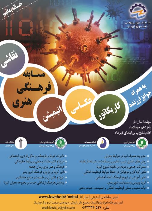 مسابقه فرهنگی هنری در بخشهای مختلف نقاشی، عکاسی، کاریکاتور و انیمیشن با همکاری مجتمع عالی آموزشی و پژوهشی صنعت آب و برق خوزستان، سازمان آب و برق خوزستان، کمیته ملی آبیاری و زهکشی ایران، کمیته منطقهای آبیاری و زهکشی خوزستان و دانشگاه جامع علمی کاربردی صنعت آب و برق خوزستان با هدف تقویت مشارکت، خلاقیت بکارگیری فرهنگ و هنر در بحران جهانی ناشی از ویروس کرونا با تمرکز بیشتر به مسئله آب و محیطزیست و جنبههای اجتماعی آن و درسهايي كه از كرونا براي سازگاری با خشكسالي وكم آبی ميتوان گرفت، برگزار خواهد شد.