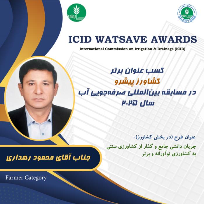 محمود رهداری، کشاورز پیشرو از شهرستان هلیلان استان ایلام، با بهبود شیوههای آبیاری و کشاورزی پایدار، موفق به کسب جایزه Watsave از کمیسیون بینالمللی آبیاری و زهکشی در سال ۲۰۲۵ شد.
